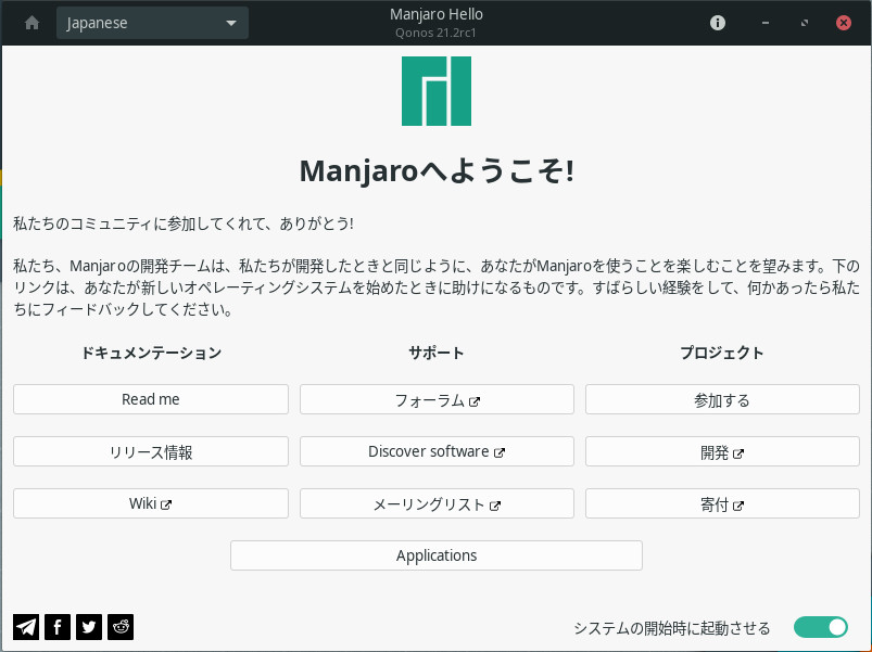 起動時に表示される「Manjaro Hello」から、日本語入力に必要なソフトウエア(Fcitx+Mozc)をインストールしていきます。