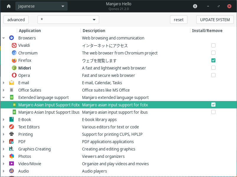 「Manjaro Asian Input Support Fcitx」の「Install/Remove」列にチェックを入れ、右上の「UPDATE SYSTEM」をクリックします。