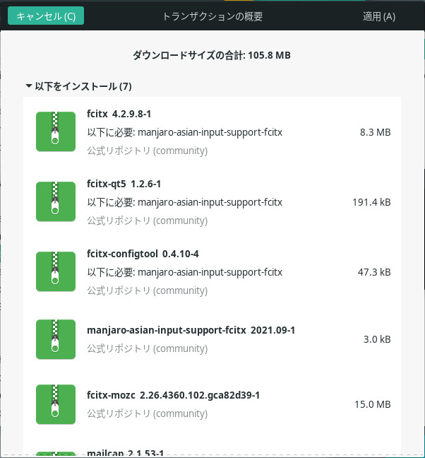 インストールするソフトウエアが表示されるので、右上の「適用」ボタンをクリックします。