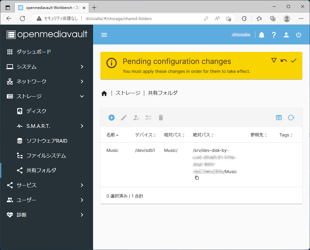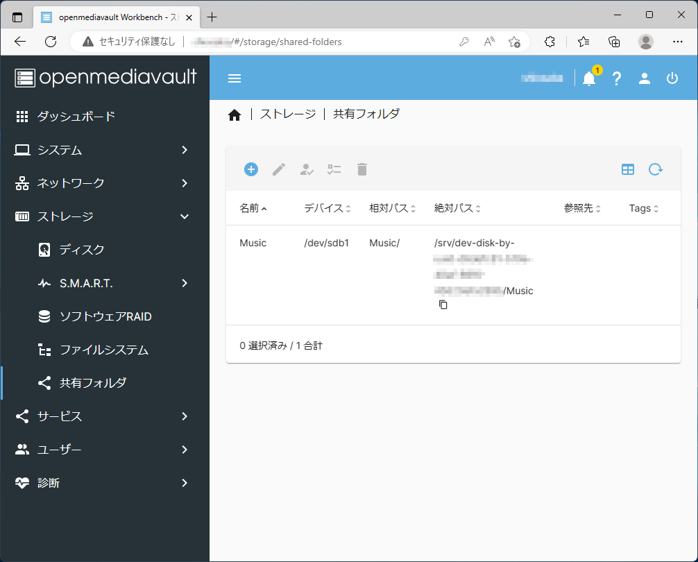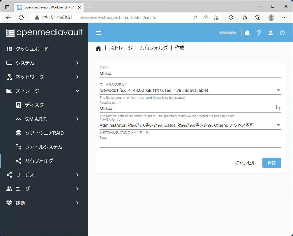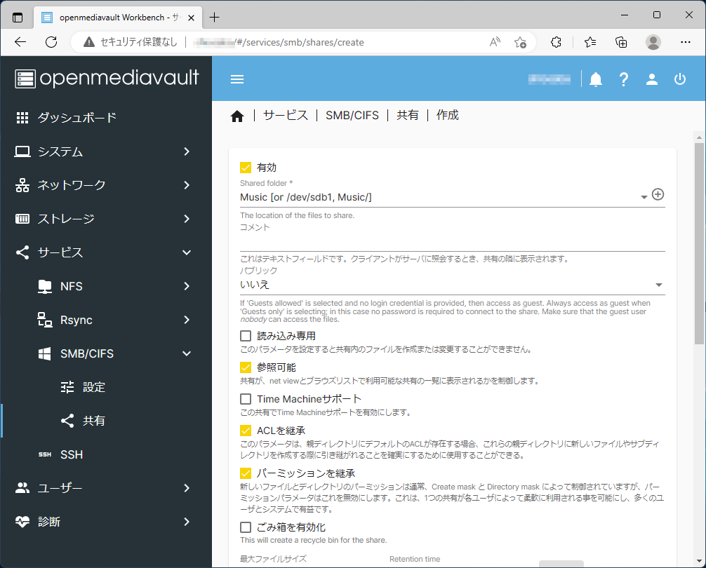 | Shared folder | 作成した共有フォルダの名前(ここではMusic) |