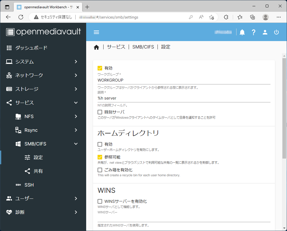 「サービス」-「SMB/CIFS」-「設定」を選択して、一番上の「有効」チェックボックスをクリックします。