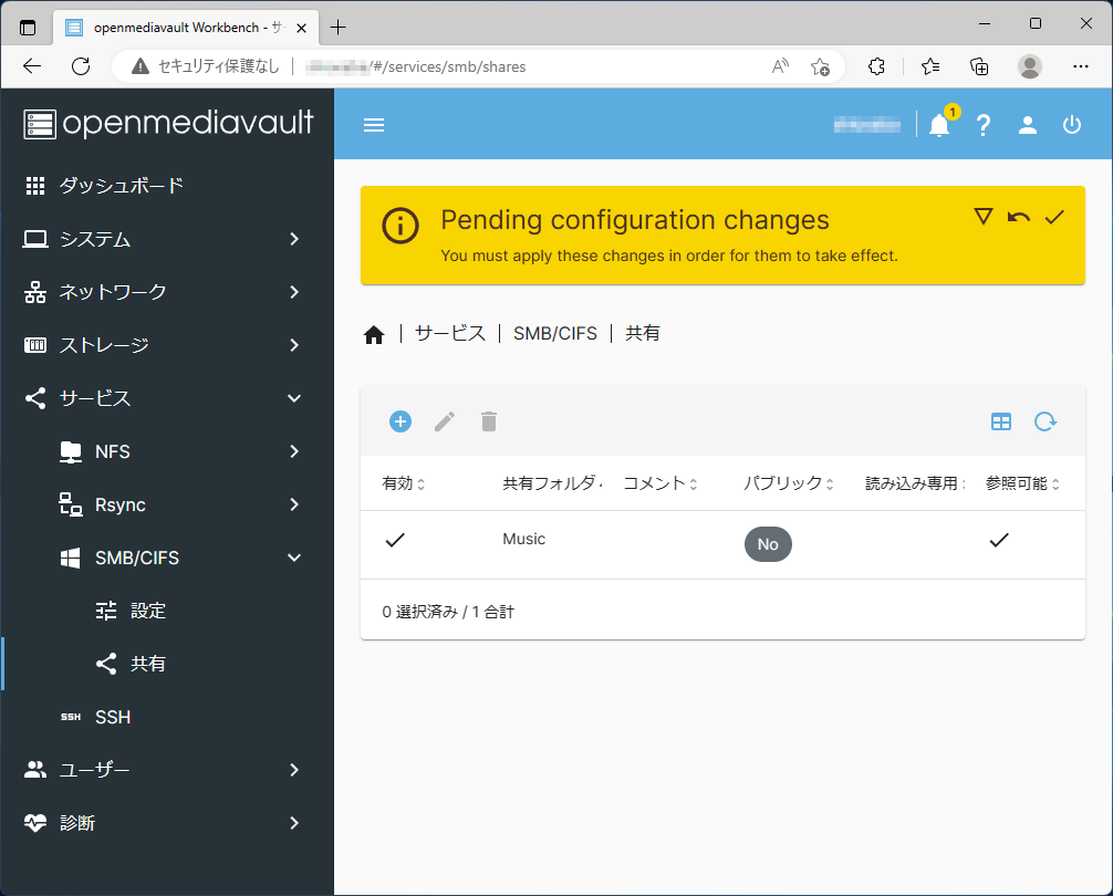 「サービス」-「SMB/CIFS」-「共有」を選択して、左上の