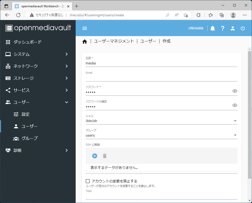 | 名前 | 作成したいユーザーの名前(ここではmedia) |