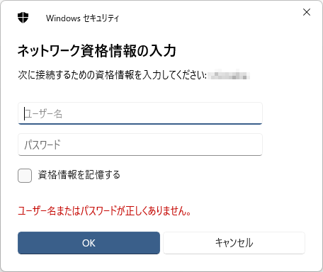 ネットワーク資格情報の入力ダイアログが表示されるので、先ほど作成したユーザー名とパスワードを入力します。