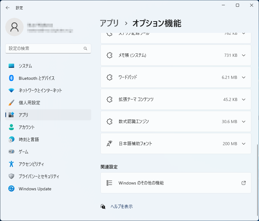 「設定」-「アプリ」を選択してから、一番下の関連設定にある「Windowsのその他の機能」を選択します。