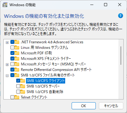 Windowsの機能ダイアログが表示されるので、「SMB 1.0/CIFSクライアント」にチェックを入れて、OKボタンを押します。