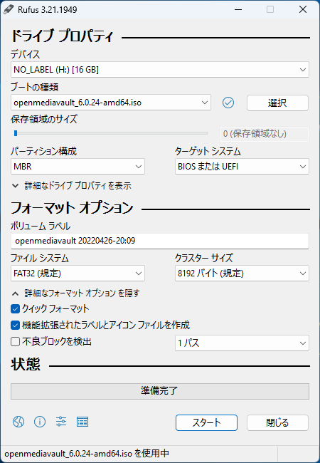 「選択」ボタンを押して、ダウンロードしたopenmediavaultのISOファイルを選択します。