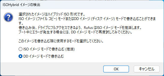 「ISOHybridイメージの検出」ダイアログが出るので、「DDイメージモードで書き込む」を選択して、「OK」ボタンを押します。