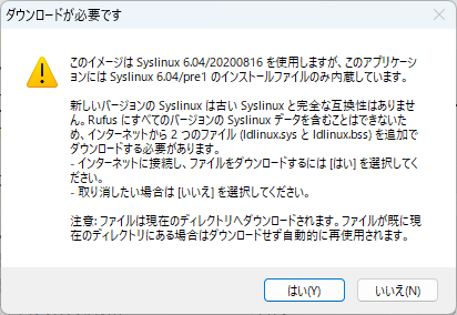 「ダウンロードが必要です」ダイアログが出た場合は、「はい」ボタンを押します。