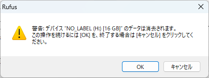 USBメモリのデータが消去されるという警告ダイアログが表示されます。