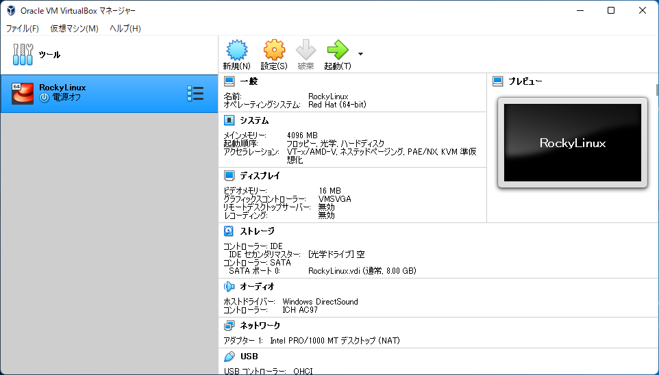 「OK」ボタンをクリックすると、RockyLinux用の仮想マシンの完成です。
