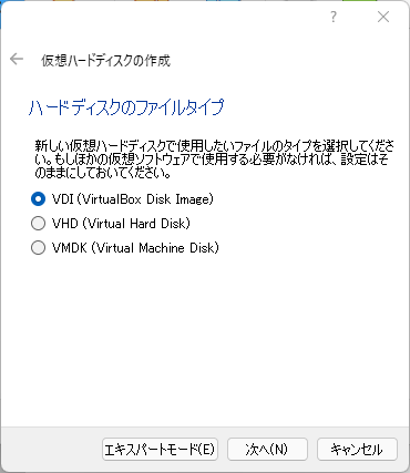 仮想ハードディスクのファイルタイプを選択します。