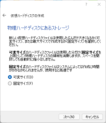 仮想ハードディスクを可変サイズにするか、固定サイズにするかを選択します。