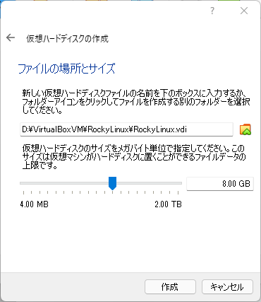 仮想ハードディスクの場所とサイズを指定します。